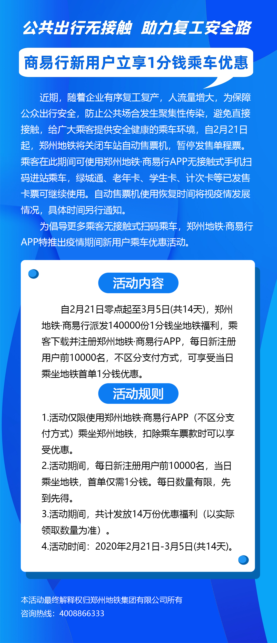 為提倡廣大鄭州市民乘客無接觸式掃碼乘車,鄭州地鐵·商易行APP自2月21日零點起至3月5日(共14天),針對新注冊用戶派發(fā)14萬份1分錢坐地鐵的福利。優(yōu)惠活動期間,自每日零點起,新用戶實名下載、注冊鄭州地鐵·商易行APP的前一萬名,不區(qū)分支付方式,可享受當(dāng)日乘坐地鐵首單1分錢優(yōu)惠。